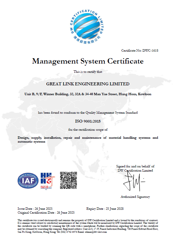 Great Link Engineering Limited has been awarded the international standard certifications of ISO 9001, ISO 14001 and ISO 45001.