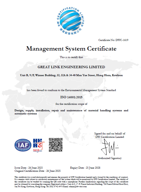 Great Link Engineering Limited has obtained the ISO 14001 International Environmental Management System Certification, demonstrating our commitment to sustainable development.