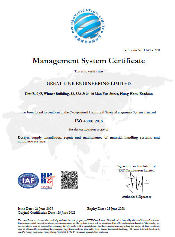 Great Link Engineering Limited has obtained the ISO 45001 International Occupational Health and Safety Management System Certification, which shows our goal to reduce occupational injuries and illnesses, and maintain the good physical and mental health of our employees.